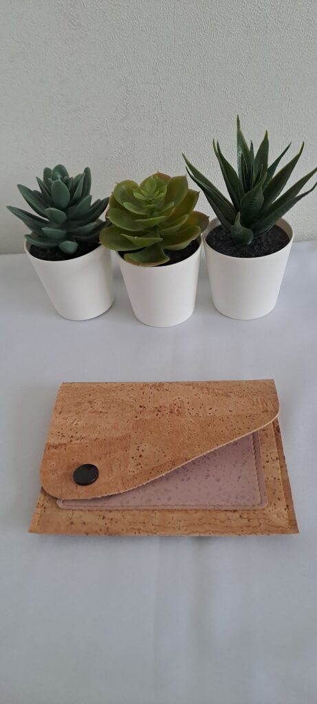 Fabriquée à la main avec du liège de qualité, cette pochette allie durabilité, souplesse et originalité. Son design épuré et sa fermeture à bouton pression en font un accessoire à la fois fonctionnel et esthétique.